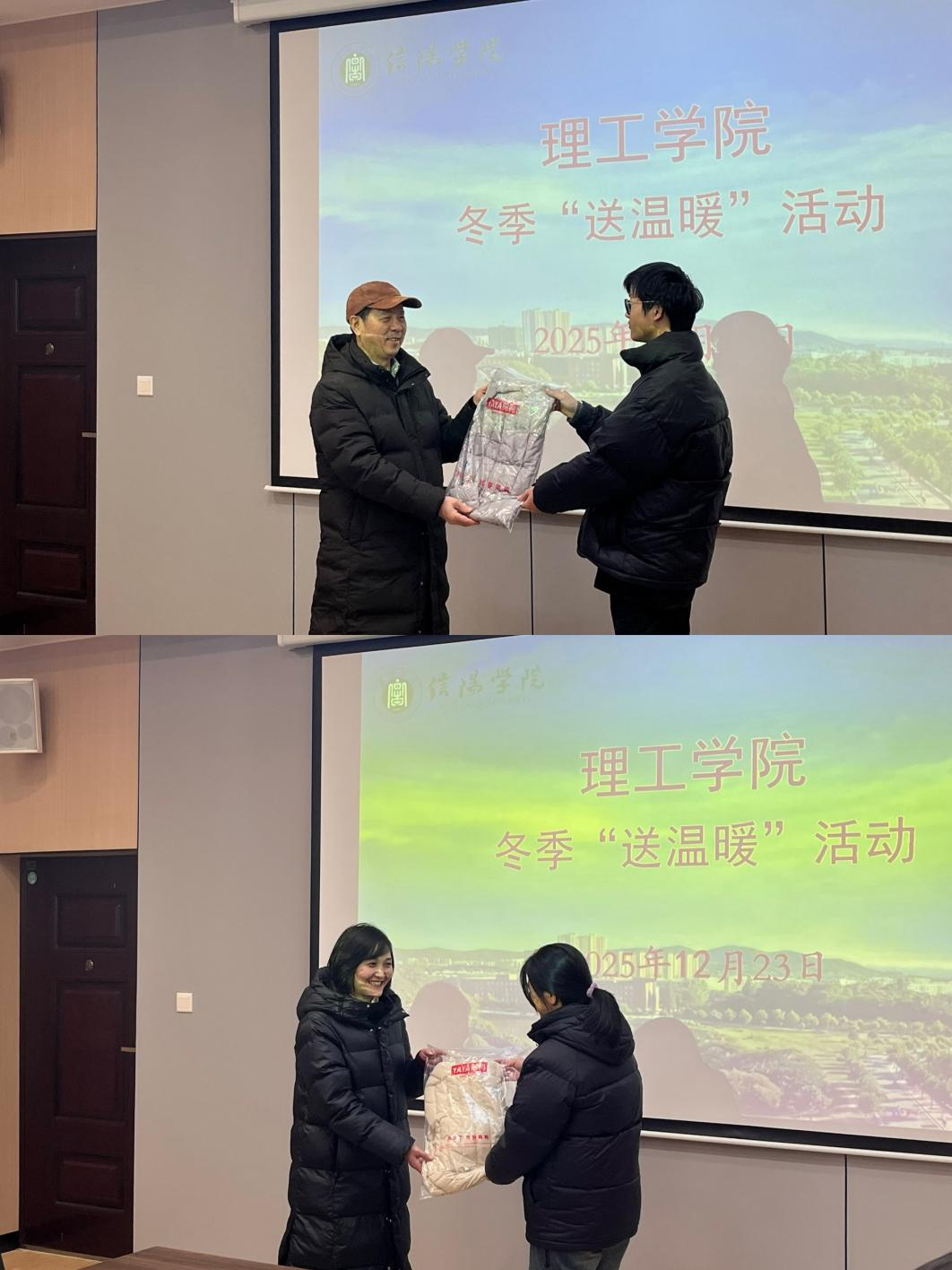 活动现场暖意融融,肖生发院长、赵佳书记亲手将一件件羽绒服递到学生手中,仔细询问同学们的学习进度、生活状况及实际困难,耐心倾听大家的心声与诉求。