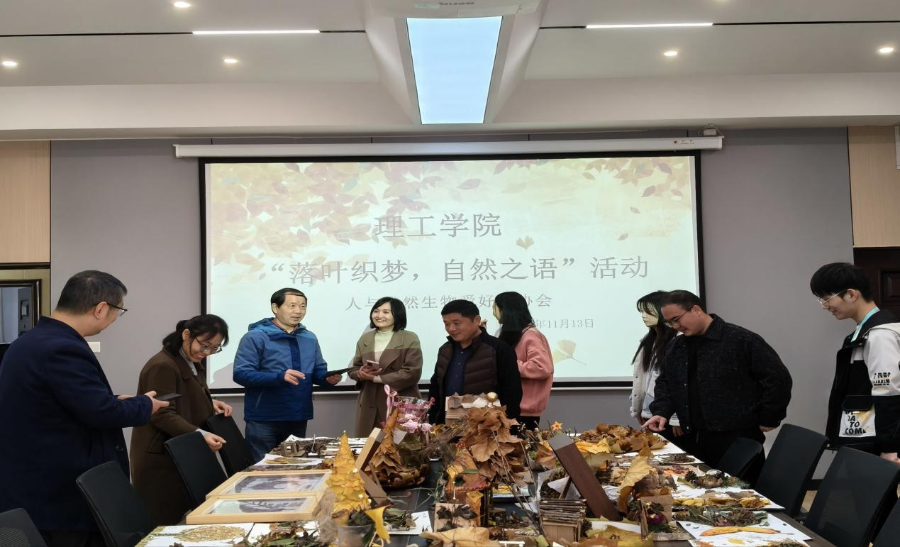 当秋意渐浓,校园里的落叶褪去翠绿、染上金黄与绯红,它们不再是萧瑟的象征,而是化身成了承载创意的“自然素材”。循着这份秋日浪漫与巧思,理工学院人与自然生物爱好者协会于2025年11月10日至11月16日在理工楼412教室以及理工楼一楼大厅,开展了以“落叶织梦,自然之语”为主题的落叶拼接活动评比及展示活动。理工学院院长肖生发、党总支书记赵佳、社团指导老师徐东亚及生物科学专业相关老师担任本次活动评委,并对作品进行筛选与点评。