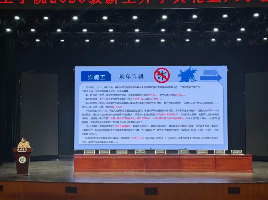 随后,学工秘书杨晓杰、教学秘书赵丹、辅导员程雯雯,分别以《理工学院2025级新生入学教育方案》《课程学习要求及教学相关制度说明》《开学反诈第一课》为主题,为2025级新生进行了入学教育。