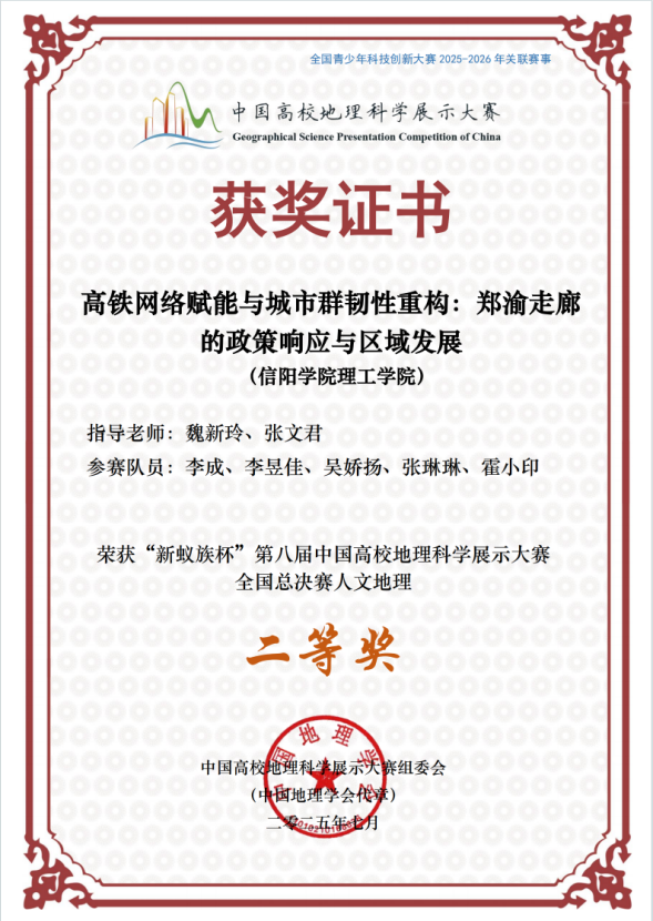近日,“新蚁族杯”第八届中国高校地理科学展示大赛全国总决赛在河南大学金明校区举行。本次大赛TYC234CC太阳成集团代表队“雁行山河队”由理工学院魏新玲老师带队,李成、李昱佳、吴娇扬、张琳琳、霍小印五位同学参赛,经过两天激烈角逐,凭借作品《高铁网络赋能与城市群韧性重构:郑渝走廊的政策响应与区域发展》(指导老师:魏新玲、张文君)荣获人文地理组二等奖。