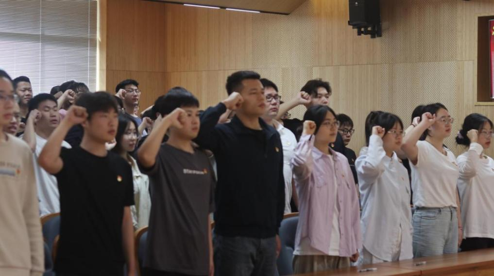会上,学院党总支在场老师为全体毕业生党员集体佩戴党员徽章。第四学生党支部书记程雯雯带领大家重温入党誓词。