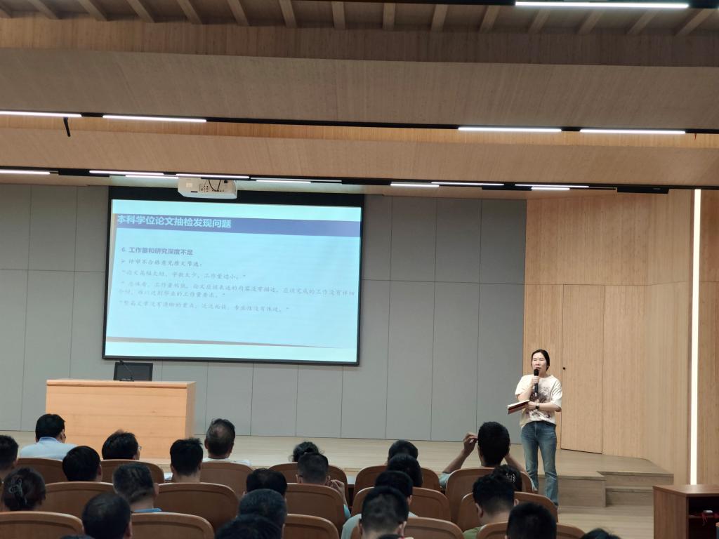 会上,教学副院长李晓严首先向大家讲解了全国毕业论文抽检工作的流程和规则,并且强调了抽检结果对于学校学院发展以及指导教师、学生的重要意义。之后,李副院长便将理工学院2024届5个专业被抽检到的9篇论文的反馈结果逐条向大家展示并讲解,虽然9篇论文均通过抽检的考验,但是在格式、内容、选题以及图表细节上暴露的问题仍然值得各位指导教师在接下来的工作中重点关注并完善。同时李副院长又向大家集中展示了在河南省学位论文质量监测工作会上所反应的毕业论文问题。