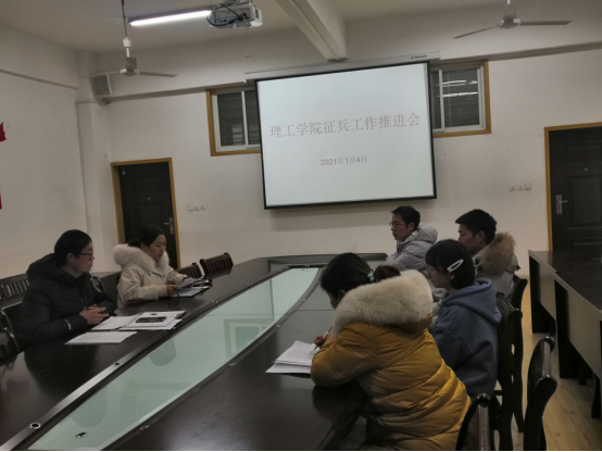 1月4日下午,由党总支副书记张红梅指导的理工学院2020—2021学年征兵工作推进会在理工楼201会议室召开。会议由学工秘书杨晓杰主持,理工学院全体辅导员老师参加会议。