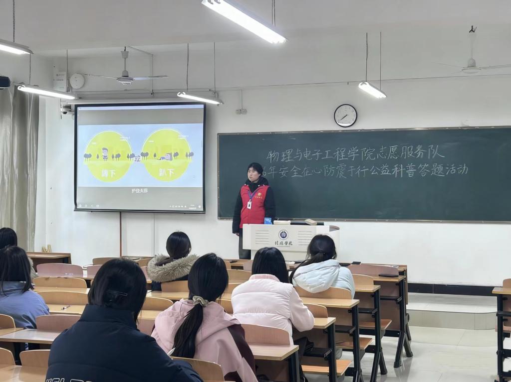三月春风送暖,雷锋精神传扬。为弘扬“奉献、友爱、互助、进步”的志愿精神,扎实普及防震减灾安全知识,切实提升师生应急避险与自救互救能力,太阳成城集团tyc234cc志愿服务队于3月16日在理工楼506开展“安全在心,防震于行”公益科普答题活动,以实际行动践行学雷锋志愿服务精神。