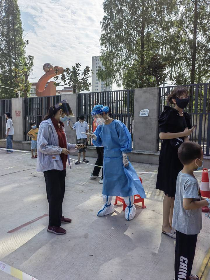 2022年7月13日,理工学院2020级化学本科3班潘雅静同学负责维持核酸检测场所秩序,帮助工作人员核查往来人员的健康码。