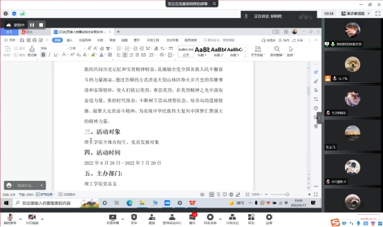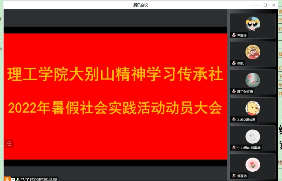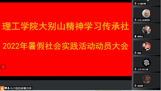 6月17日,理工学院大别山学习传承社通过腾讯会议召开了2022年暑假社会实践活动动员大会。理工学院副社长杨晓杰主持了会议,党总支副书记张红梅出席了会议,副社长甘玉锋、马子栋,全体辅导员,全体社员,各班联络员,发展党员组长参加了此次会议。