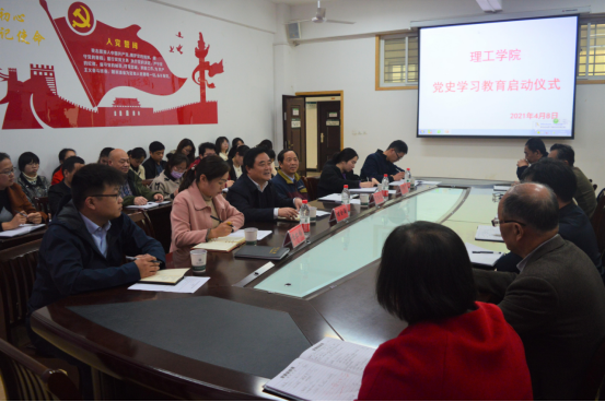 4月8日下午,理工学院在理工楼会议室举行党史学习教育启动仪式。校党委书记褚金海,理工学院院长肖生发、党总支副书记张红梅、副院长李晓严,校党办教师杨浩然出席会议,学院全体教师及学生党员代表参加会议。