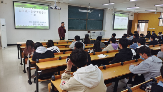 11月20日中午,理工学院于人文楼106教室举办第四期学生干部培训班第二讲。本次培训由理工学院学工秘书杨晓杰主讲,参会人员为第十五届团总支学生会全体部长与主席团,各社团负责人以及20、21级各班班委。