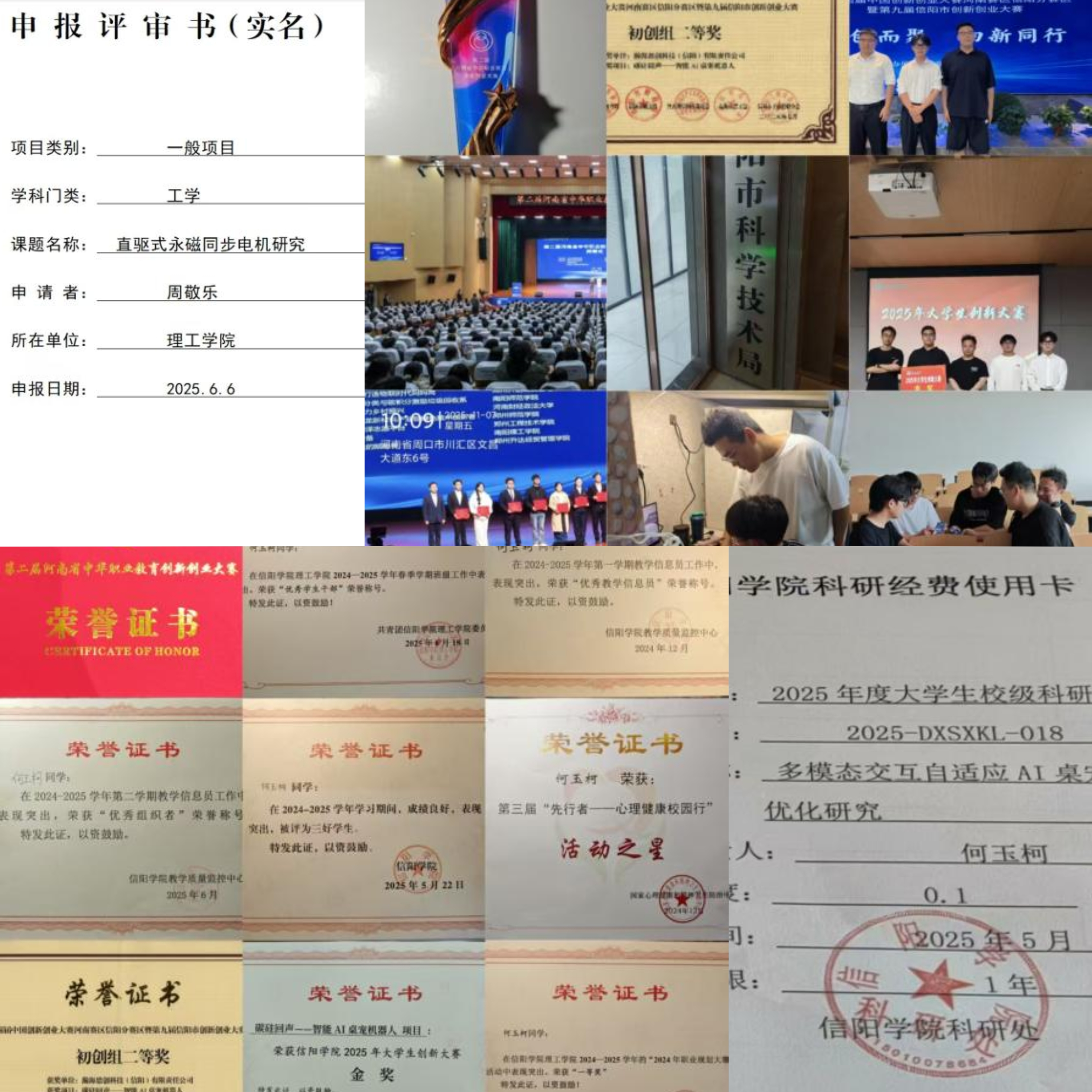 深耕专业,勇创佳绩。依托专业优势,何玉柯同学牵头带动宿舍参与科研与竞赛,成果显著。科研上,2025年何玉柯同学作为负责人牵头校级科研立项《多模态交互自适应AI桌宠系统优化研究》,李恒宇、王荣凯参与,项目进入初期研发;同时何玉柯以主要成员参与周敬乐老师的校级科研立项《直驱式永磁同步电机研究》,负责数据采集分析。并且何玉柯以第一发明人申报的专利正在审核,预计2026年3月获批。