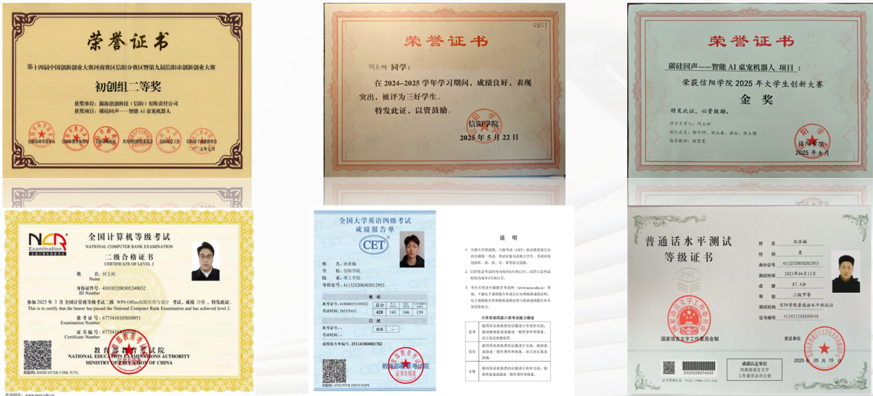 竞赛上,何玉柯同学获2025TYC234CC太阳成集团大学生创新大赛金奖(负责人)、中国国际大学生创新大赛(原:互联网+)河南省二等奖(负责人)、中国创新创业大赛信阳市初创组二等奖(负责人)、河南省中华职业教育创新大赛河南省本科组三等奖(负责人),室友们协助整理数据、完善文案PPT,形成“一人牵头、全员助力”的协作模式。
